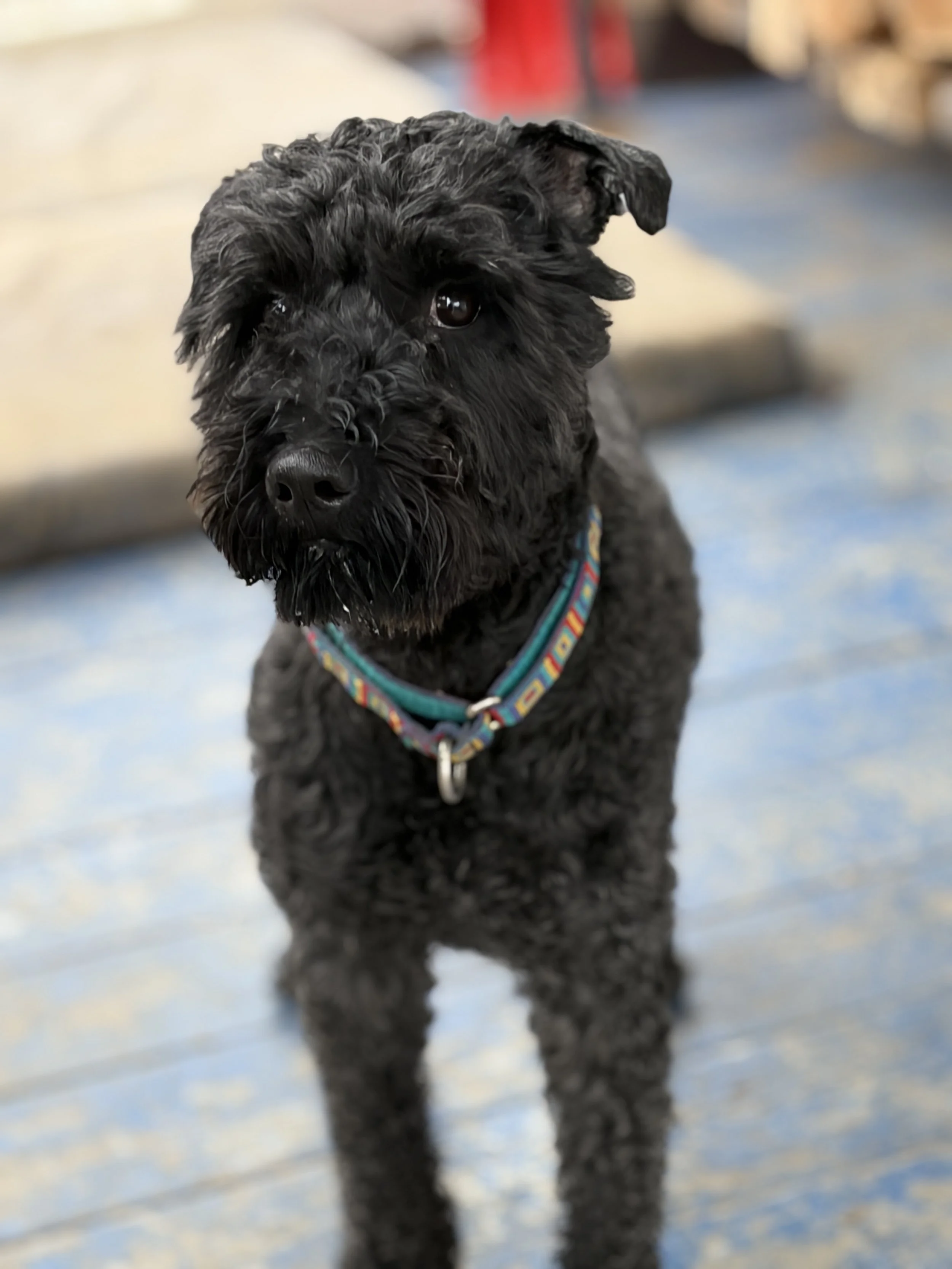 Panda is a small Kerry who loves dogs and people. He is a very sweet and gentle boy. Over the past three weeks he has been tested with lots (lots!) of different dogs, along with people and some children over five.